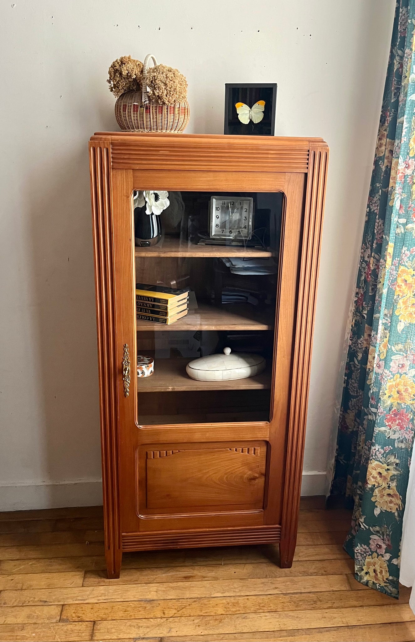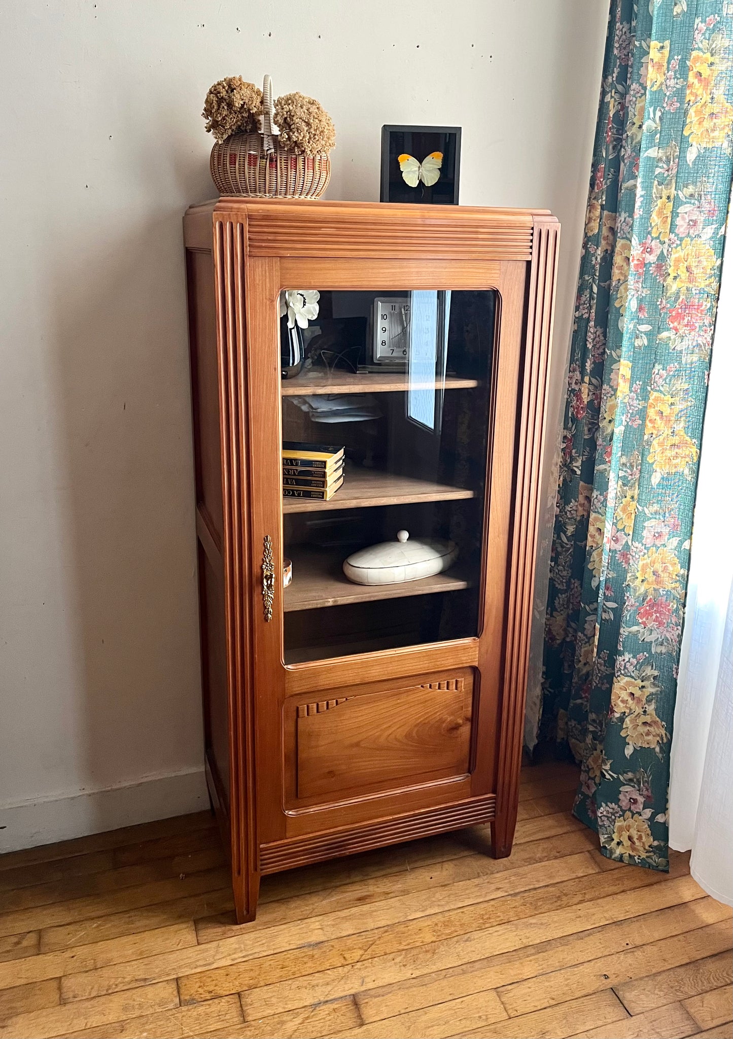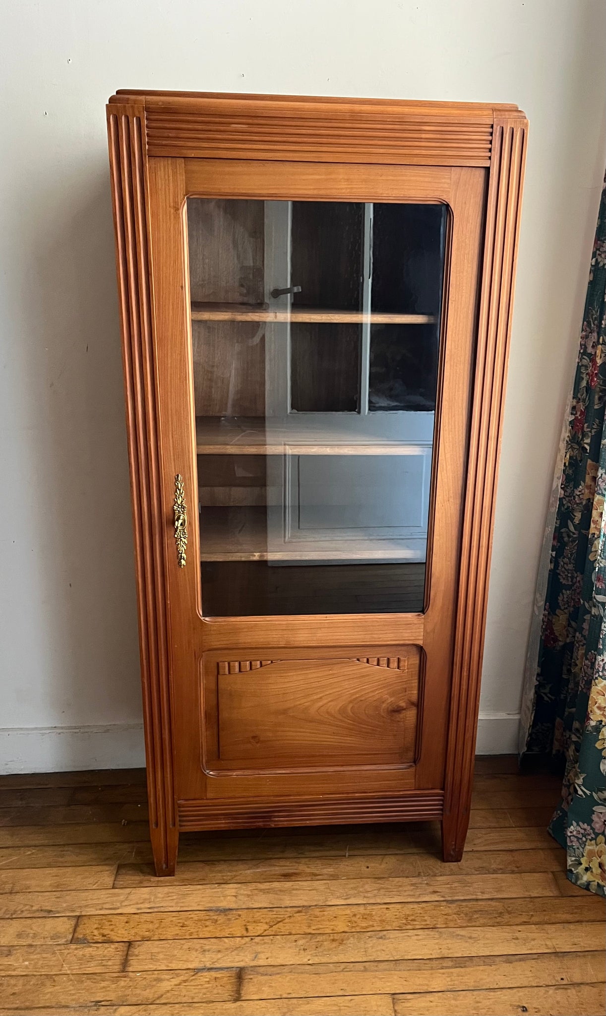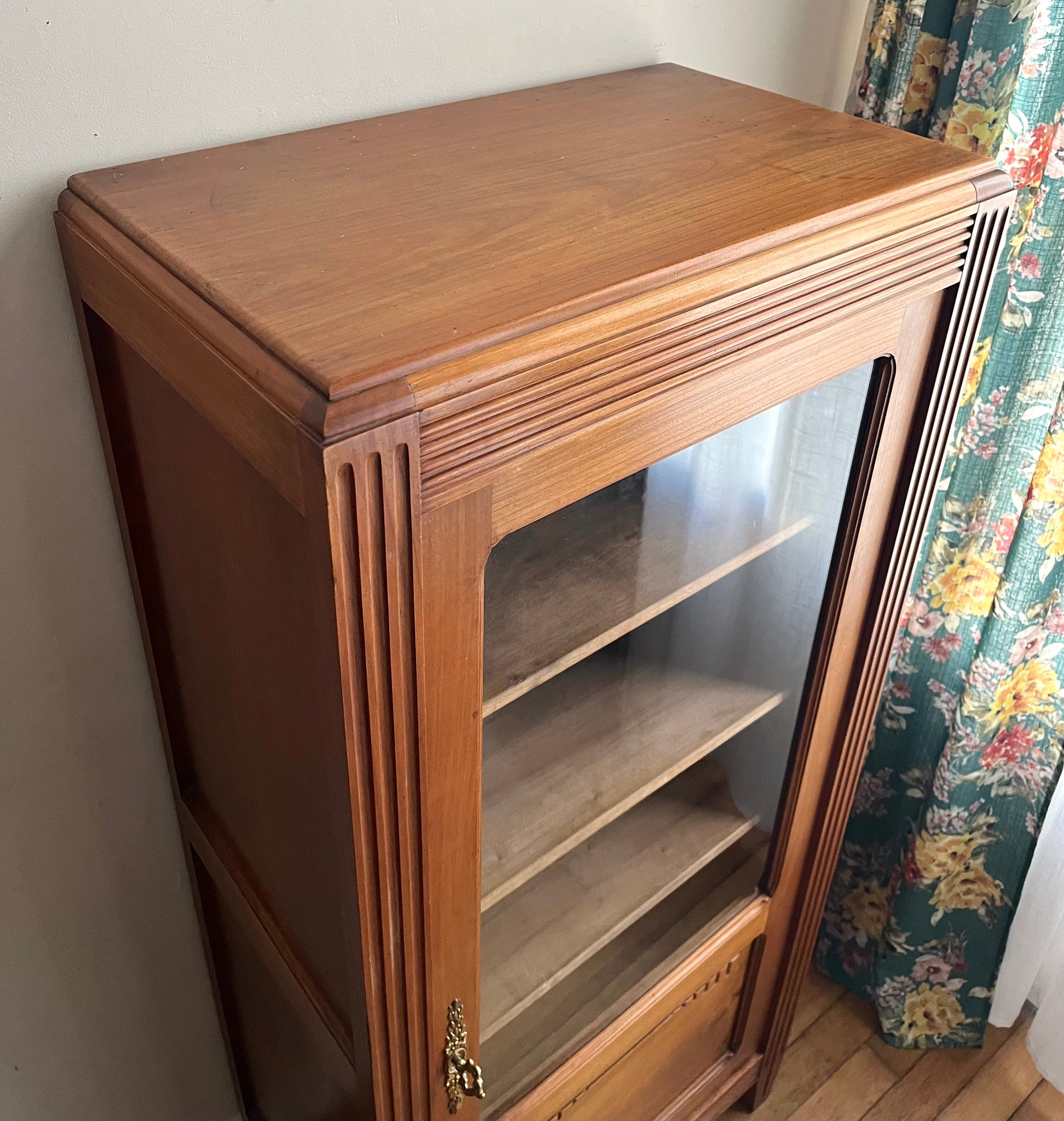 Bonnetière vitrée en bois teinté en très bon état d'usage. 4 étagères intérieures qui offrent une bonne capacité de rangement pour ce petit meuble qui occupe qu'une faible place au sol. Une pièce pleine de charme qui trouvera facilement sa place.