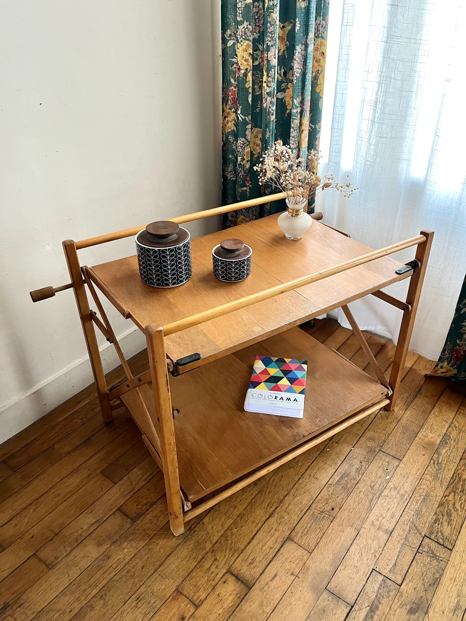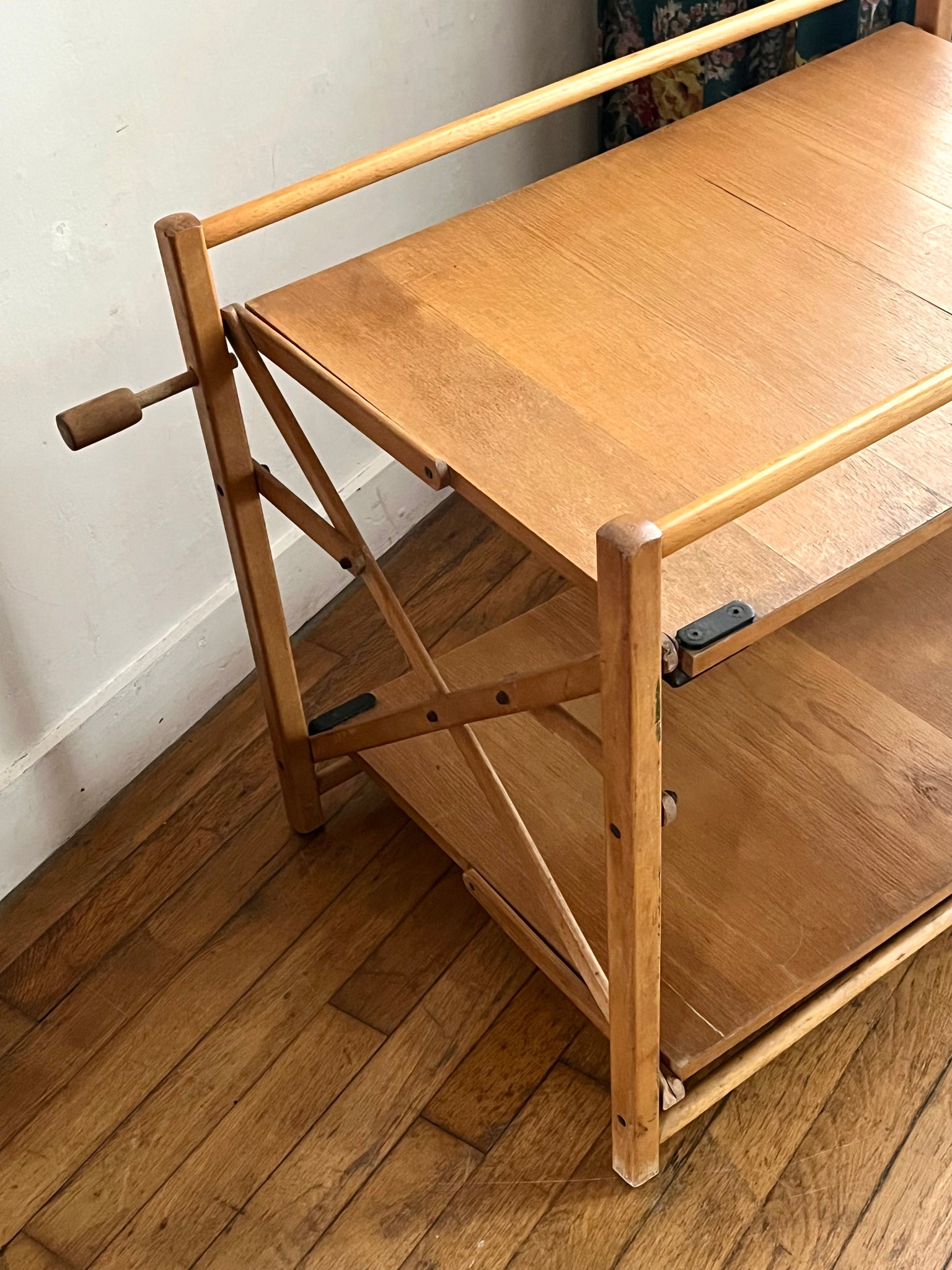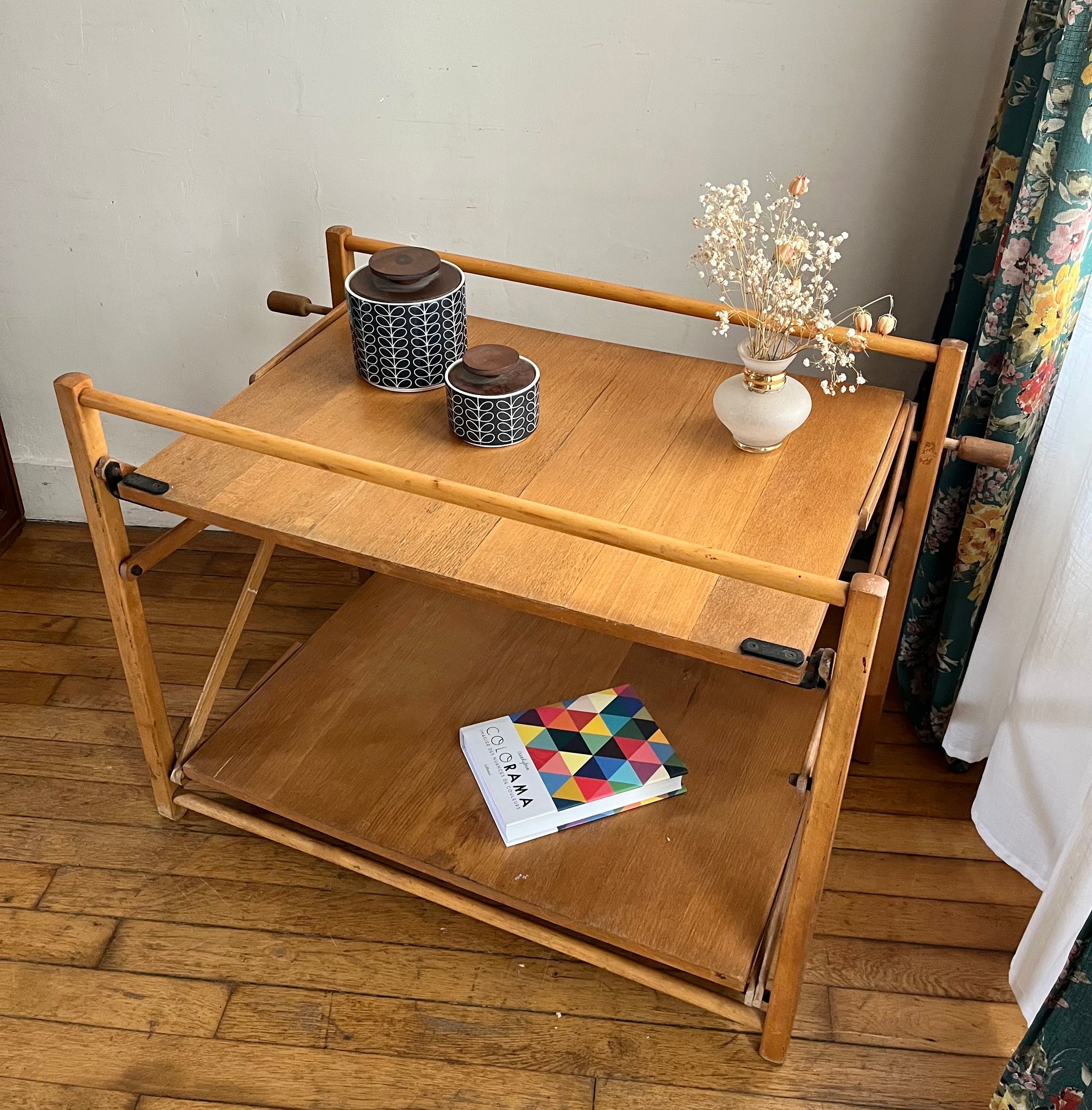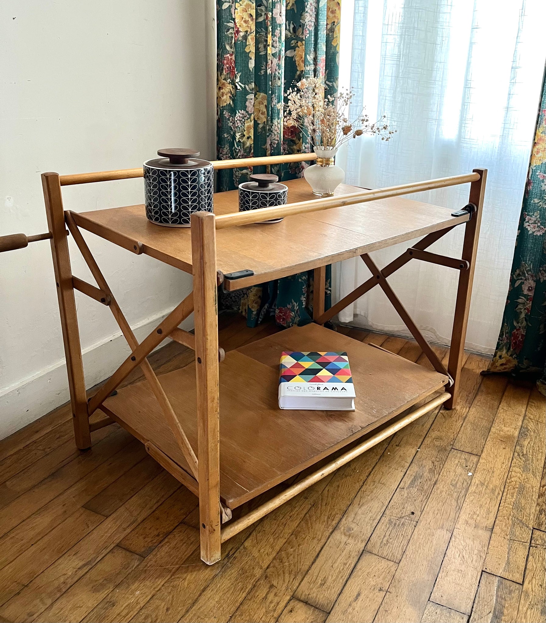 Desserte pliante des années 70 à double plateaux. Elle se replie sur elle-même très facilement, idéale pour les petits espaces. Elle est en bon état d'usage mais avec des traces du temps passé.