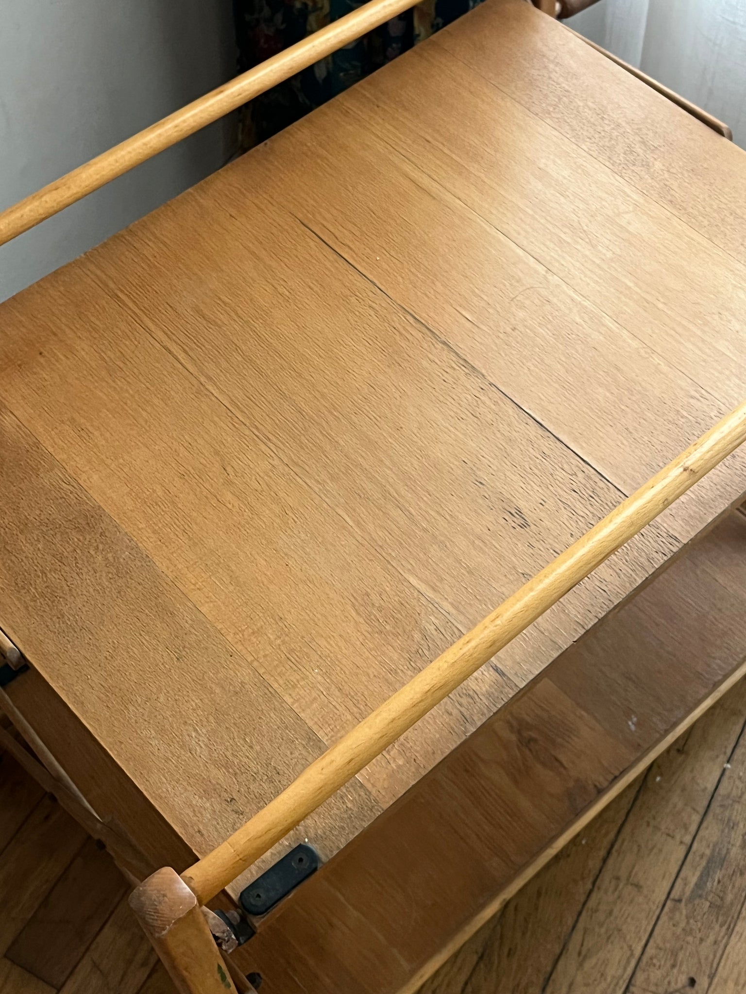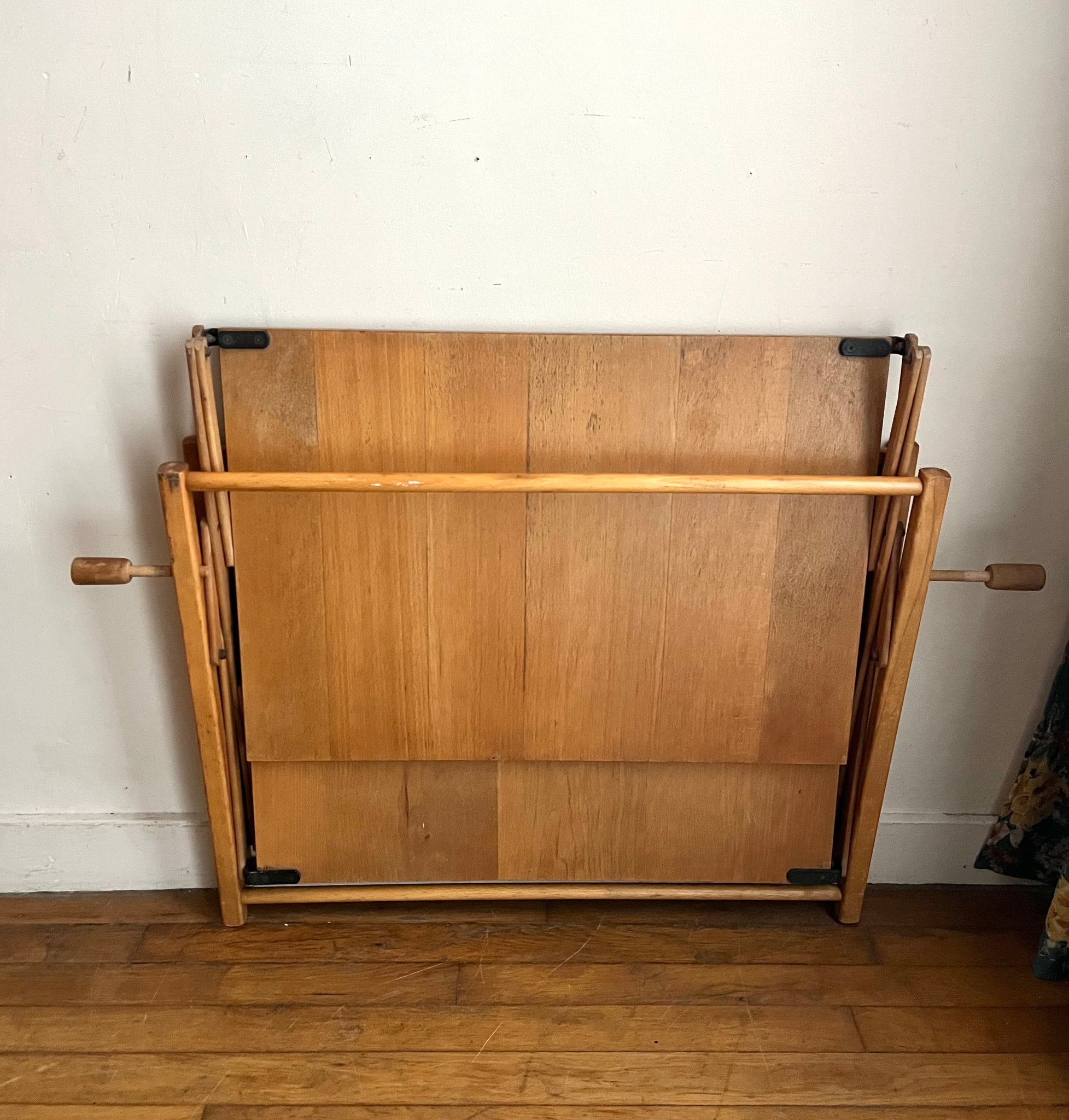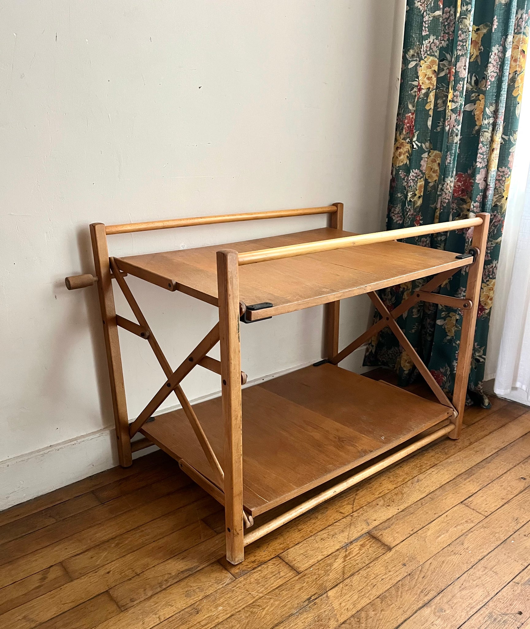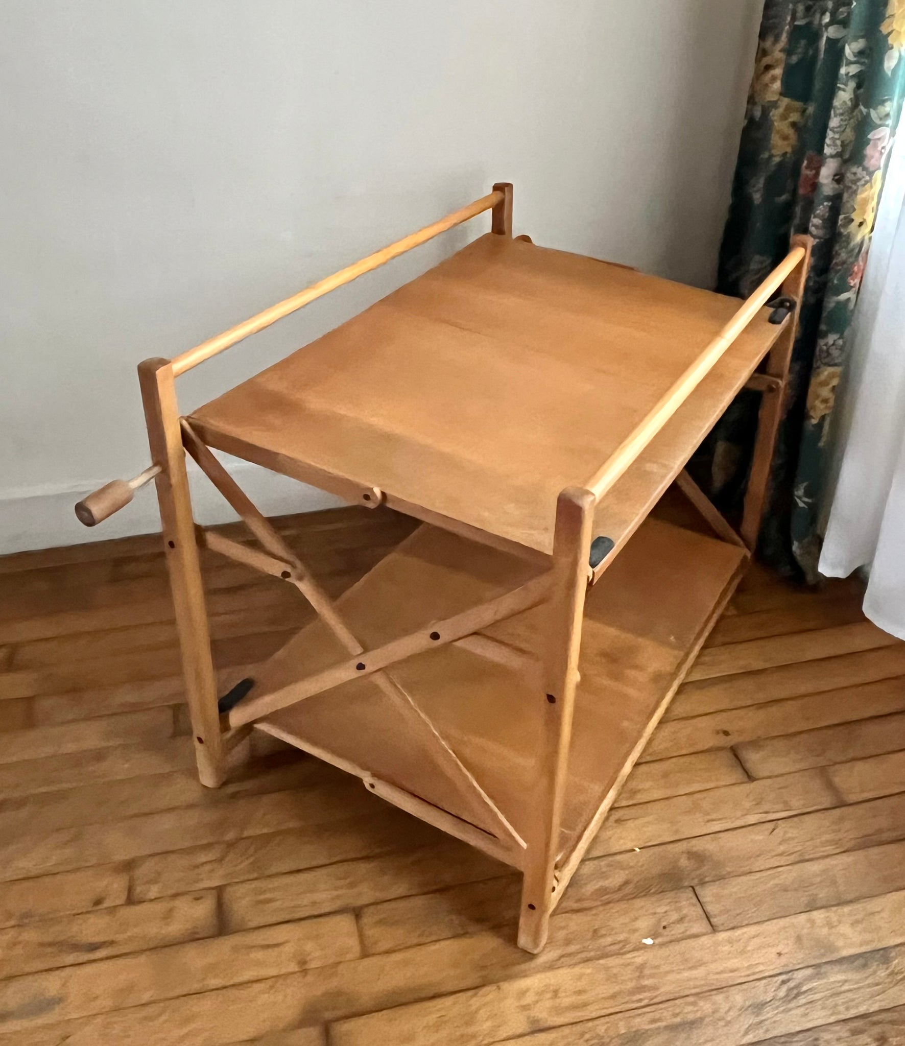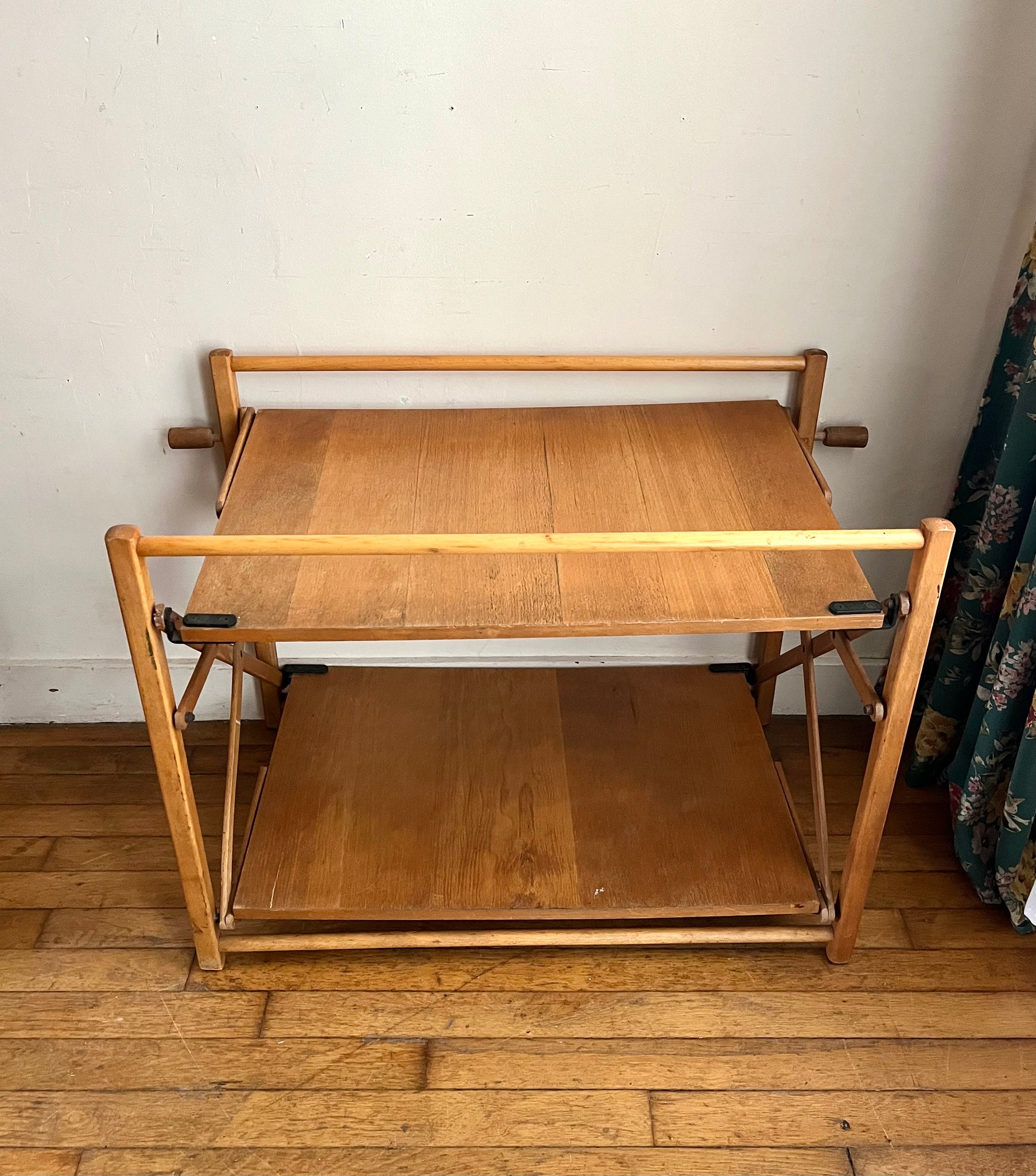 Desserte pliante des années 70 à double plateaux. Elle se replie sur elle-même très facilement, idéale pour les petits espaces. Elle est en bon état d'usage mais avec des traces du temps passé.